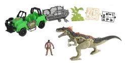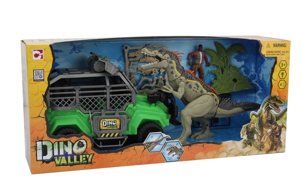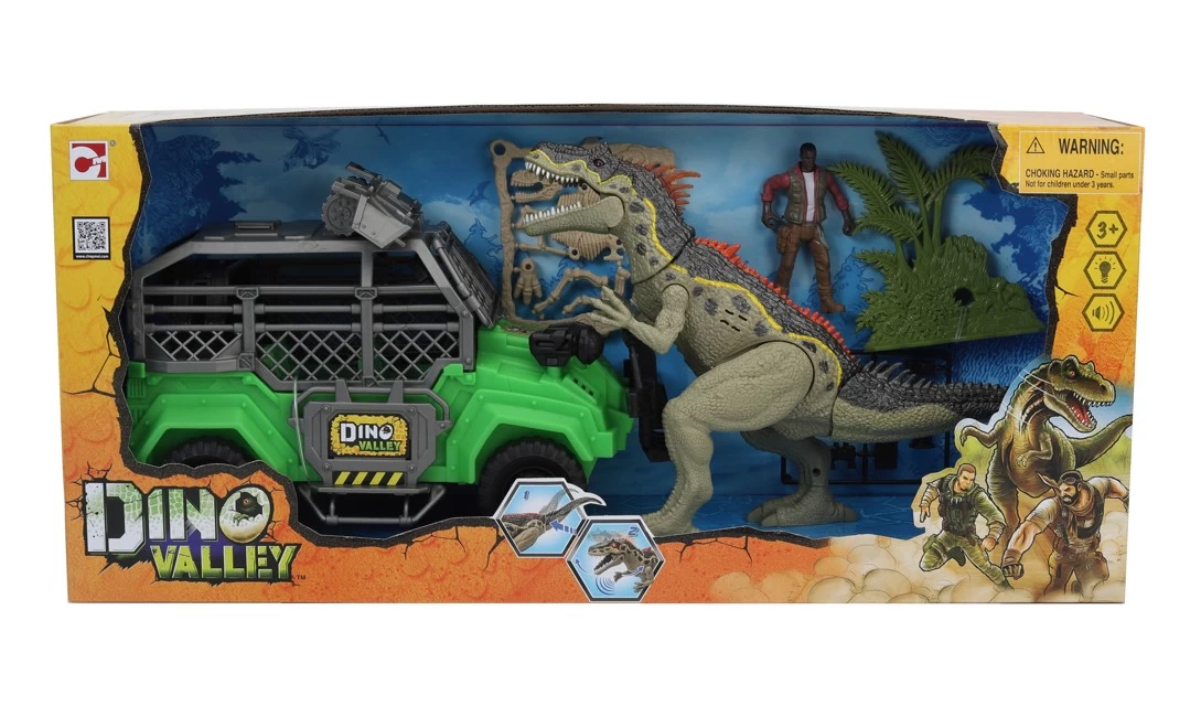 Die fossile Paläontologin Trace muss den Allosaurus in das Schutzgebiet Dino Valley zurückbringen, und Sie können dabei helfen! Als Experte für Dinosauriermerkmale hat Trace die furchterregende Bestie in einem abgelegenen Teil des Waldes aufgespürt. Platziere Trace in der konvertierbaren Capture-Rig und schicke ihn im freilaufenden Fahrzeug dahin. Das abnehmbare Oberteil kann in einen Käfig umgewandelt werden, sodass Trace es an der Rückseite des Rigs befestigen und die Kreatur für ihren sicheren Transport und ihre Rückkehr gefangen nehmen kann. Dinosaurier hat bewegliche Beine, Arme und Kiefer und brüllt, wenn Sie den Knopf drücken. Enthält auch eine bewegliche Actionfigur und ansteckbare Waffen, Werkzeuge und Zubehör für zusätzlichen Spielspaß. Eigenschaften: Das Spielset enthält 1 Jeep, 1 Dinosaurier, 1 Figur und Zubehör. Ansteckbare Waffe und Zubehör. Dinosaurier mit Licht und Ton. Jeep mit Freilauf.