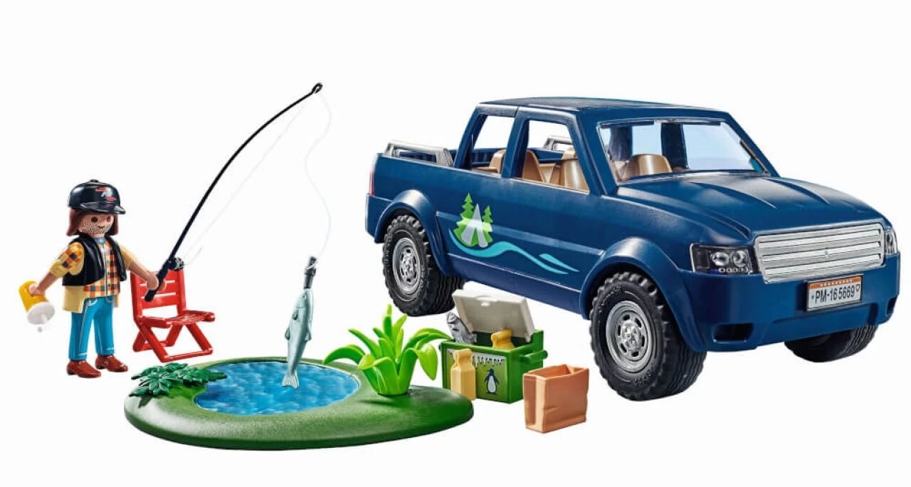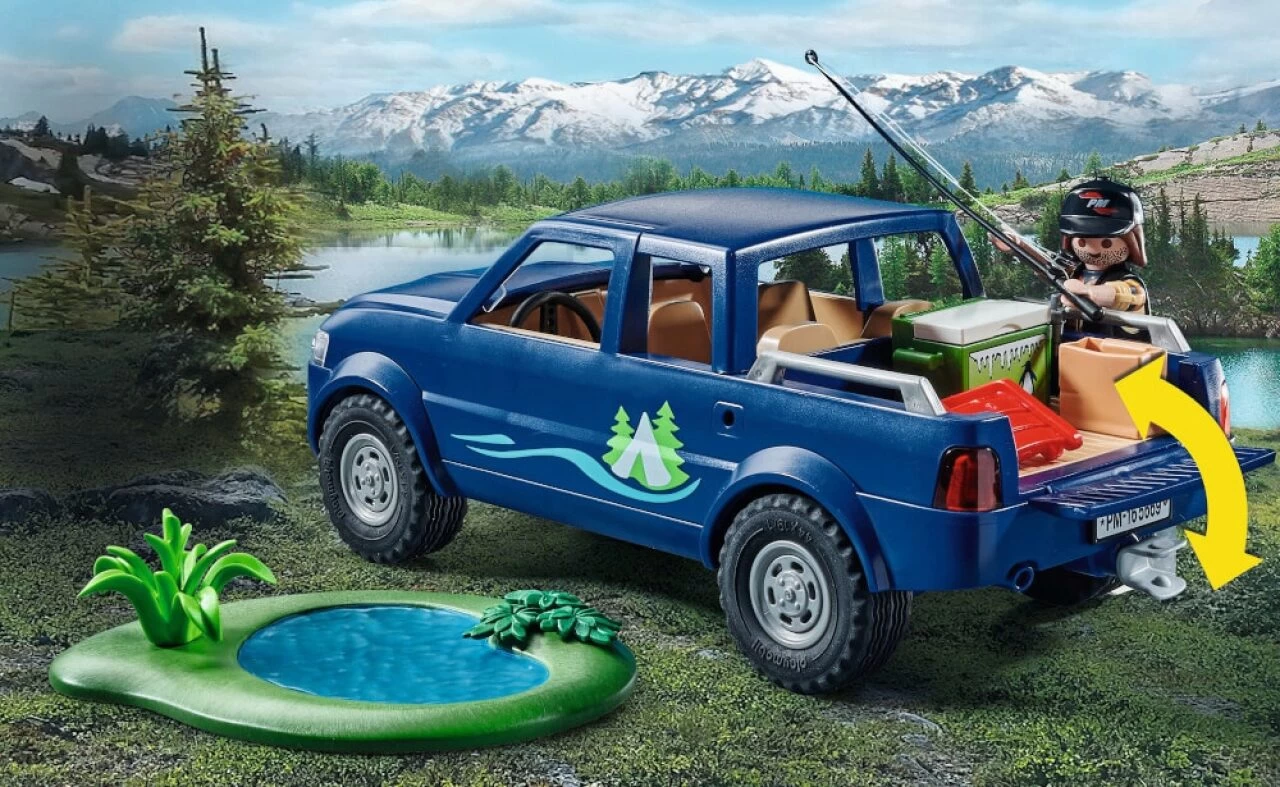 Stürz dich hinein ins fröhliche Outdoor Abenteuer mit dem PLAYMOBIL® Angelausflug. Der schnittige blaue Truck mit abnehmbarem Dach bietet alles für einen ausgedehnten Ausflug zum See. Der Proviant sowie das Angelzubehör mit Kisten, Angel und Stuhl können auf der Ladefläche verstaut werden. Im Inneren des Autos ist Platz für insgesamt vier PLAYMOBIL®-Figuren. Ein detailreiches Spielset für fantasievolle Wildnisabenteuer. Das Set enthält eine PLAYMOBIL®-Figur, einen Pick-up mit Ladefläche und Anhängerkupplung, Angelzubehör und viele weitere Extras. Die Heckklappe kann zum Beladen der Transportfläche nach unten geklappt werden und rastet beim Hochklappen ein.