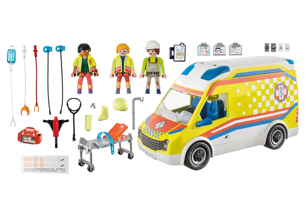 Zubehör: 1 Rettungswagen mit Licht- und Soundmodul, 1 Krankentransportliege, 1 Infusionsbeutel mit Infusionsschlauch,1 Defibrillator, 1 Dokumentationsmappe, 3 Diagnosetafeln, 3 Schienenverbände, 1 Bauhelm, 1 Luftdruckhammer, 1 Kopfverband, 2 Gipsverbände, 1 Etikettenbogen mit Verbandmaterial, 1 Armbanduhr, 1 Stetoskop