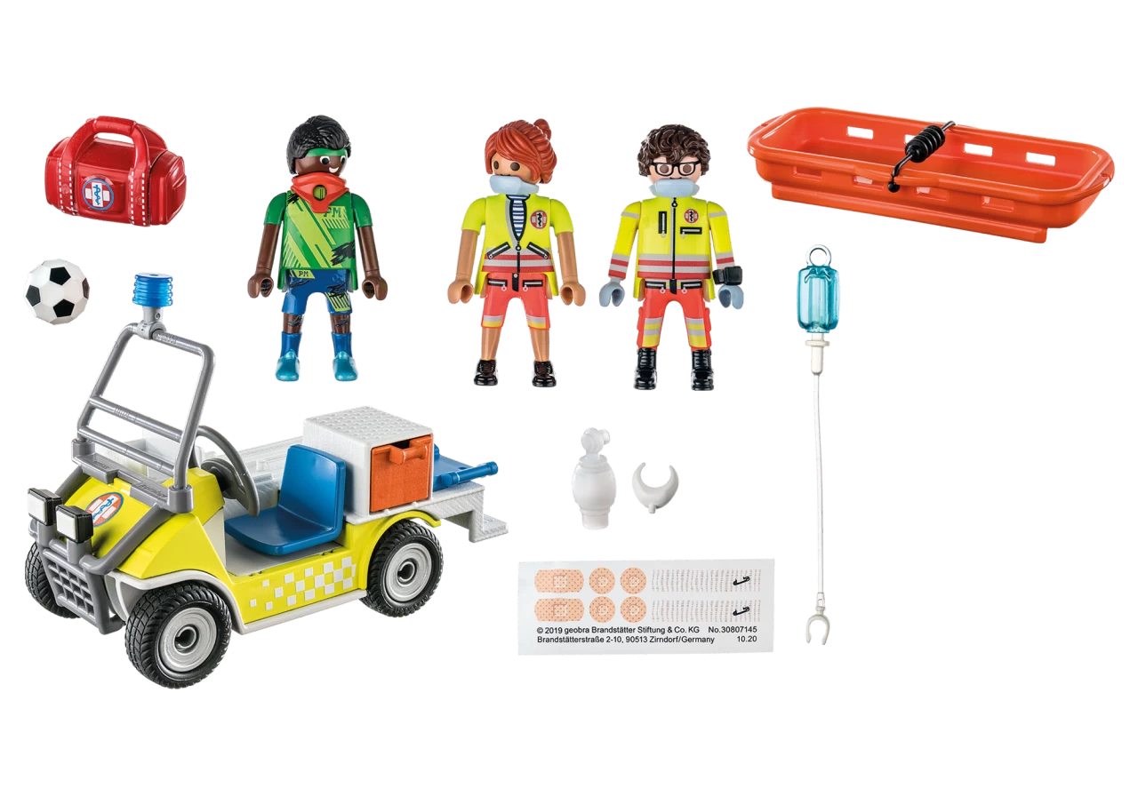 Zubehör: 1 Rettungscaddy, 3 Masken, 1 Halstuch, 1 Armbanduhr, 1 Beatmungsbeutel, 1 Transportliege, 1 Verbandstasche, 1 Etikettenbogen mit Verbandsmaterial, 1 Infusion m. Infusionsschlauch, 1 Fussball