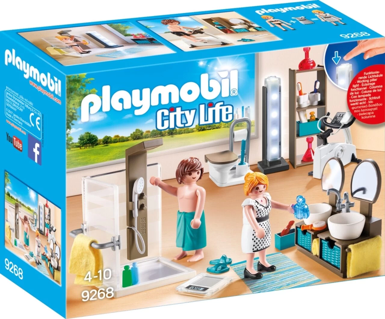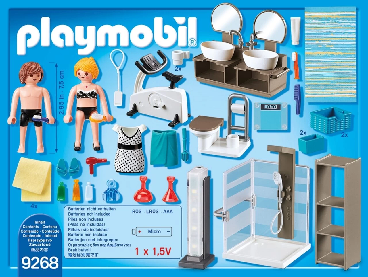 Figuren: 1 Mann, 1 Frau; Tiere: keine; Zubehör: 1 Dusche, 1 Doppelwaschtisch, 1 Lichtsäule, 1 Toilette, 1 Heimtrainer, 1 Regal, 1 Kleid, 1 Badetuch, 1 Waage, 4 Handtücher, 2 Kisten, 2 Körbe, 1 Paar Badeschlappen, 1 MP3-Player, 2 Flakons, 3 Kosmetikflaschen, 1 Tube, 2 Zahnbürsten, 1 Parfumflakon, 2 Becher, 1 Klobürste, 1 Teppich, 1 Haarbürste, 1 Kamm, 1 Fön