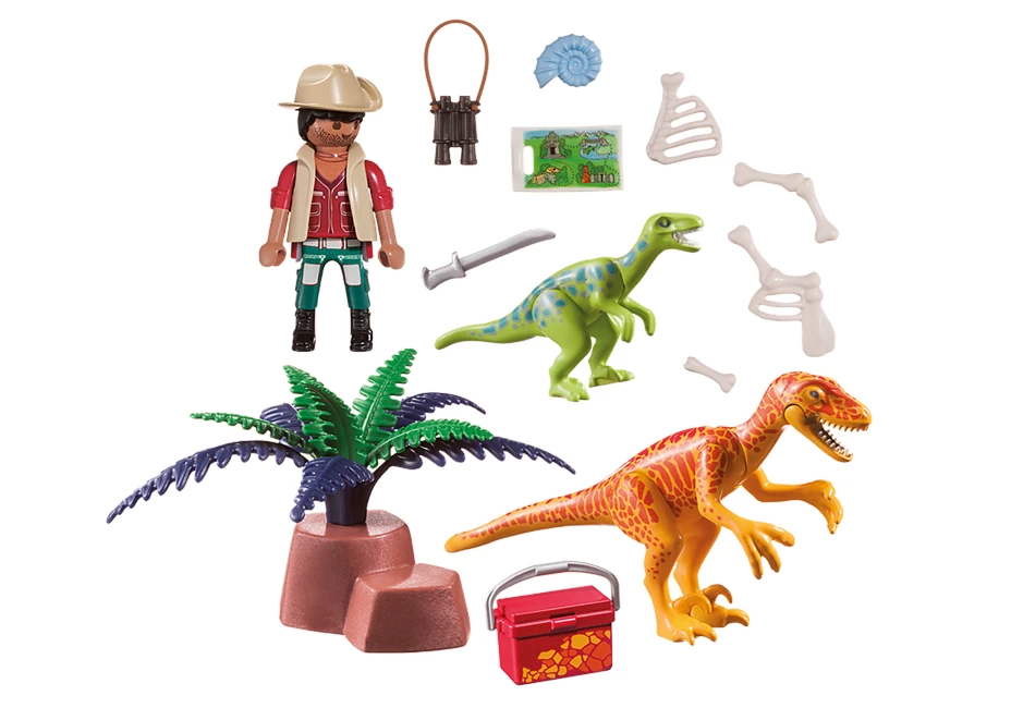 Figuren: 1 Entdecker; Tiere: 2 Velociraptoren; Zubehör: 1 Dino Explorer Tragetasche, 3 Knochen, 1 Schale, 1 Fahrgeschäft, 1 Box mit Deckel, 1 Fernglas, 1 Karte