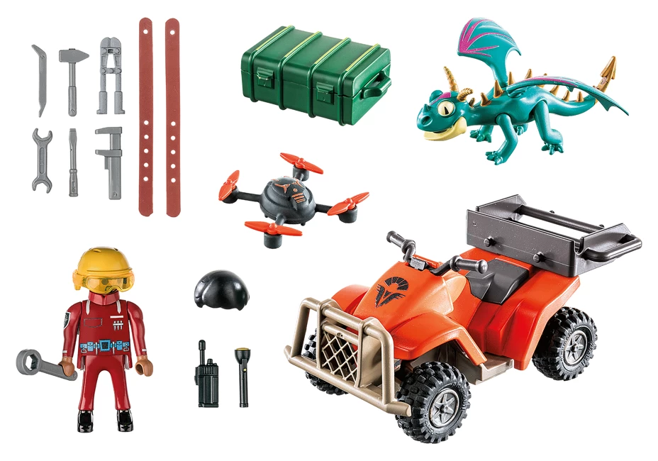 Enthält D'Angelos Vater Phil und den Drachen Terrible Terror. Quad mit Gepäckträger und Rückzugmotor. Abmessungen Quad: 11 x 7 x 6 cm (LxTxH). 1.300 Jahre nach den Ereignissen von Drachenzähmen leicht gemacht sind Drachen für die moderne Welt nur noch eine Legende. Als eine geologische Anomalie einen riesigen, kilometertiefen Riss in der Erdoberfläche aufreißt, versammeln sich Wissenschaftler aus der ganzen Welt in einer neuen Forschungseinrichtung, um das mysteriöse Phänomen zu untersuchen. Bald deckt eine Gruppe von Außenseitern, die von ihren Eltern an die Stätte gebracht wurden, die Wahrheit über Drachen und ihre Verstecke auf – ein Geheimnis, das sie für sich behalten müssen, um zu schützen, was sie entdeckt haben. Phil Baker ist D'Angelos Vater und Sicherheitschef im Icaris-Labor. Tauchen Sie ein in neue Drachengeschichten mit dem Spielset Dragons: The Nine Realms – Icaris ATV & Phil von PLAYMOBIL. Phil kommt zusammen mit einem Schrecklichen Schreckensdrachen sowie einem Quad und Figurenzubehör. Der Schreckliche Schrecken von PLAYMOBIL hat einen aufklappbaren Unterkiefer, bewegliche Beine und beide Flügel sind drehbar. Das komplette Set enthält den Dragons: The Nine Realms-Charakter Philip Baker und einen schrecklichen Schrecken, ein Quad mit Pullback-Motor, eine Drohne, ein Werkzeugset und andere Extras für coole Drachenabenteuer. Empfohlen ab vier bis zehn Jahren. Warnung. Erstickungsgefahr. Enthält einen kleinen Ball und Kleinteile. Nicht für Kinder unter 3 Jahren.
