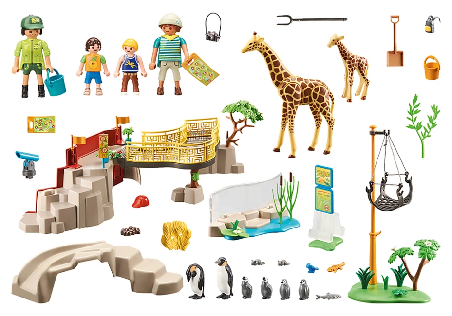 | Verpackungsinhalt | Figures: 1 man, 1 woman, 1 girl, 1 boy; Animals: 1 giraffe, 1 baby giraffe, 2 penguins, 4 baby penguins, 4 pegs, 2 mice, 1 lizard, 1 bird; Accessories: 1 entrance gate with stairway and observation path with 2 flags and information board, 1 large rock with tree, 2 demarcation elements moat with water plants and glass wall, 1 green area with tree and pole with giraffe food basket, 1 penguin rock large with slide, 1 camera, 1 telescope, 1 display board with clock, 4 site plans, 1 bucket large with food insert, 2 plant pots with plants, 1 shovel, 1 pitchfork, 1 cap, 1 visor cap |