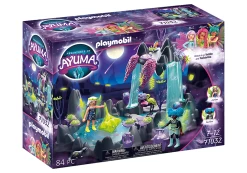 Die Mondfeen, eine neue Feenrasse, erschüttern mit ihrem Sternenorakel die heile Welt in Ayuma. Durch das Drehen des Kreisels in der Mitte des Sees werden die Sterne in Bewegung gesetzt. Je nachdem, wohin die Sterne fallen, kann ein „Blutmond“ auftreten und die Mondfeen verwandeln sich. Ein neues Abenteuer beginnt! Enthält 2 Mondfeen mit SeelentierenNeue mysteriöse Feen erscheinen in Ayuma: Die Mondfeen. Mit ihrem Sternenorakel bringen die Mondfeen den Feenwald so richtig durcheinander. Um die nächste Mondphase vorherzusagen, führen sie am Mondfeensee ihr magisches Sternorakel durch. Dazu wird der Kreisel in der Mitte des Sees in Bewegung gesetzt. Je nachdem in welche Mulde die Sterne fallen, kann es zu einem Blutmond kommen und die Gesichtsausdrücke der Mondfeen verändern sich. Die magische Quelle wird von den drei Wasserfällen des schwimmenden Felsens gespeist. Das Set beinhaltet zwei Mondfeen mit ihren Seelentieren Otter und Reiher, einen Eisvogel, eine Feenquelle, einen Kreisel, Kristalle und viele weitere magische Extras. Die Mondfeen-Figuren haben veränderbare Gesichter. Die hängenden Blumen leuchten im Dunkeln.