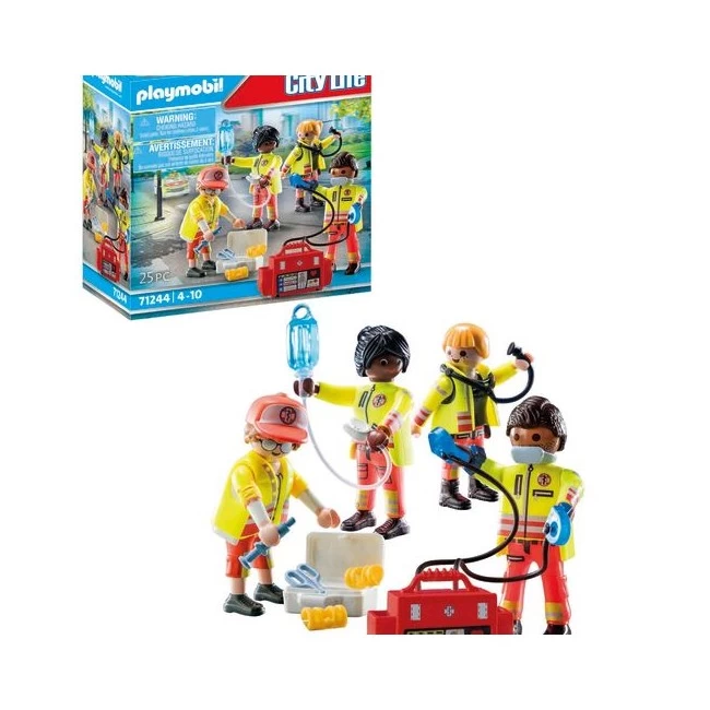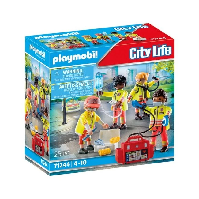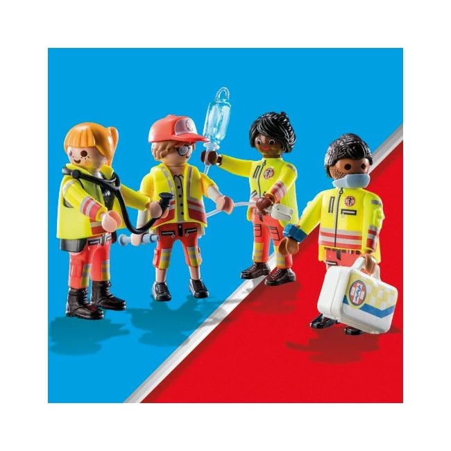 PLAYMOBIL-Rettungsteam mit umfangreicher Ausstattung zur Patienten-Versorgung an der Unfallstelle! Inkl. Neuer Defibrillator-Tasche!Schließe dich dem PLAYMOBIL-Rettungsteam an und werde zum Helden des Alltags. Das vierköpfige Team ist nicht nur bestens ausgebildet, sondern auch ideal gerüstet für alle Notfälle. Im Falle eines Herzinfarktes haben die Sanitäterinnen und Sanitäter ihre moderne Defibrillatortasche dabei. Mit dem Defibriallator kann Patienten schnell geholfen werden. Defibrillatortasche und Arztkoffer bieten Platz für weiteres medizinisches Zubehör wie Schere, Pinzette und Verbandsschienen. Die Schienenverbände aus Silikon passen sich flexibel an. Ran ans Stethoskop und auf in den Einsatz!Das detailreiche Spielfigurenset für Kinder ab 4 Jahren enthält vier PLAYMOBIL-Figuren, Infusionsflasche mit Schlauch, Erste-Hilfe-Instrumente, Verbandsschienen, Arztkoffer und weiteres Zubehör für spannende Notfallmissionen im Kinderzimmer. Kopfbedeckungen, Mundschutzmaske und Uhr können den Figuren abgenommen werden. Die PLAYMOBIL City Life Reihe beinhaltet moderne Fahrzeuge und realitätsgetreue Modelle, mit denen Kinder wichtige Fähigkeiten und Selbstvertrauen entwickeln können.