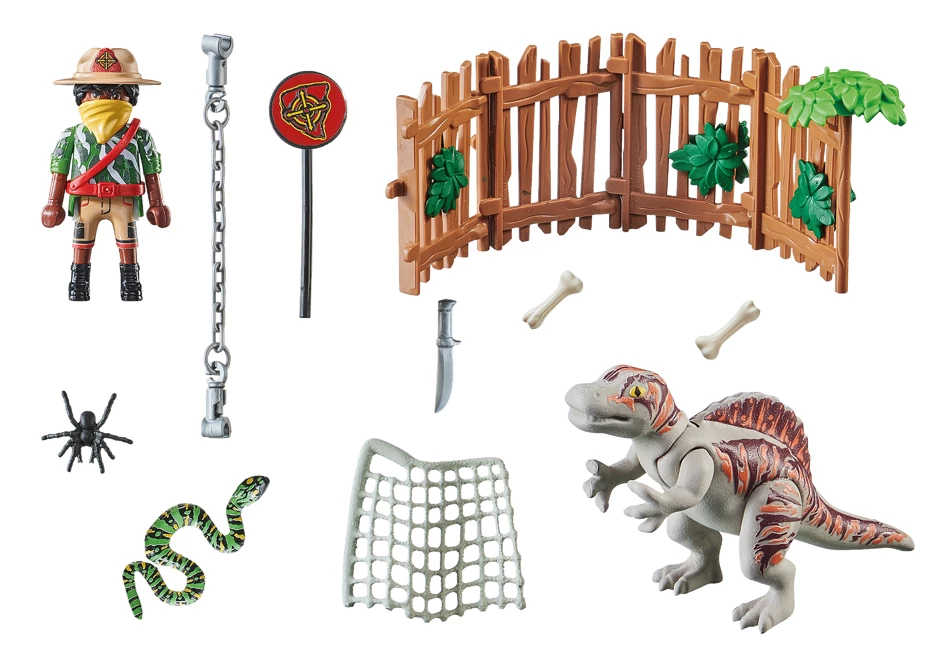 Kann das Team das Spinosaurus-Baby aus seinem Käfig und vor seinen Entführern retten? Mit Käfig, Absperrung und vielen weiteren Accessoires. Inkl. 1 Figur.Welcome to the Jungle! Ihr nächstes Abenteuer führt Team Dino Rise in den Dschungel. Böse Wilderer haben ein Spinosaurus-Baby gefangen und in einen Käfig gesperrt. Das kann Team Dino Rise natürlich nicht tatenlos hinnehmen. Doch um den kleinen Dinosaurier zu befreien müssen sie den Schurken überlisten und den Käfig öffnen. Mit originellen Charakteren, eindrucksvollen Dinosauriern und raffinierten Rüstungen bietet die Dino Rise-Spielwelt von PLAYMOBIL die perfekte Kombination aus Dino Action und Spielspaß. Ein tolles Geschenk oder Mitbringsel für Dinofreunde ab 5 Jahren.