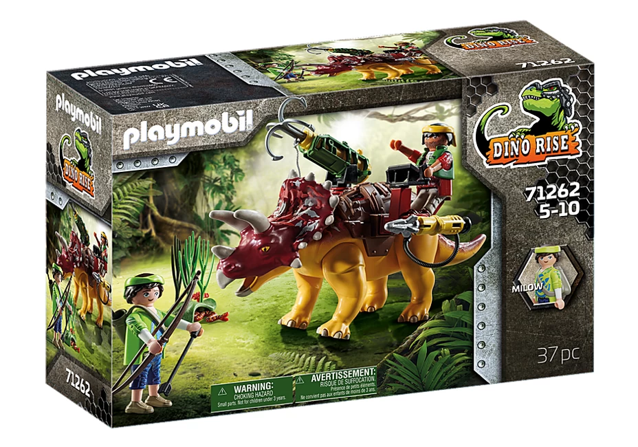 Kann Milow den Triceratops aus den Händen der Schmuggler befreien und die entsprechende Ausrüstung zielgerichtet mit und nicht gegen seine Freunden einsetzen? Inklusive abnehmbarer Rüstung, großer beweglicher Kanone mit Enterhaken und kleiner seitlicher Kanone mit Geschssen, sowie einem Netz für Geschosse und einem Stehsitz für Milow auf der Rüstung. Inkl. 2 Figuren.Stürz dich mit den Dinos ins große Dschungelabenteuer! Milow schlägt sich durch das Dschungeldickicht und versucht den Triceratops aus den Händen des gemeinen Bösewichts zu befreien. Doch das ist gar nicht so leicht, denn der Schurke hat sich auf dem Stehplatz auf dem Rückenpanzer des Dinos positioniert und lädt gerade die Kanone. Wenn Milow sich nicht beeilt, bekommt er es mit einem brandgefährlichen Dino-Mensch-Gespann zu tun. Mit originellen Charakteren, eindrucksvollen Dinosauriern und raffinierten Rüstungen bietet die Dino Rise-Spielwelt von PLAYMOBIL die perfekte Kombination aus Dino-Action und Spielspaß. Ein tolles Geschenk oder Mitbringsel für Dinofans ab 5 Jahren.