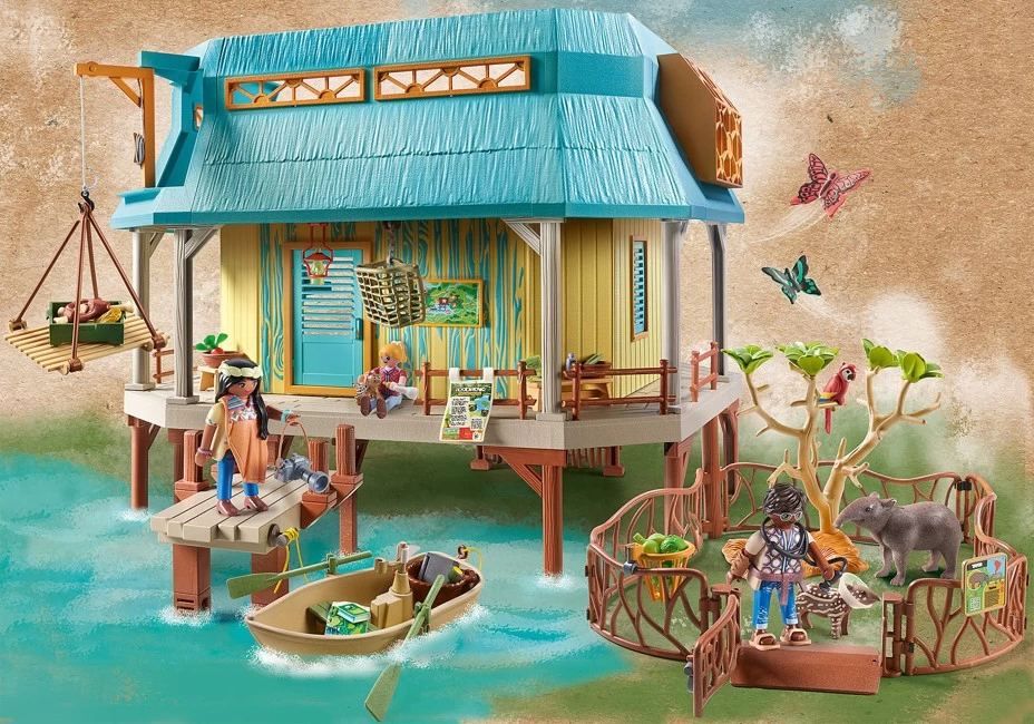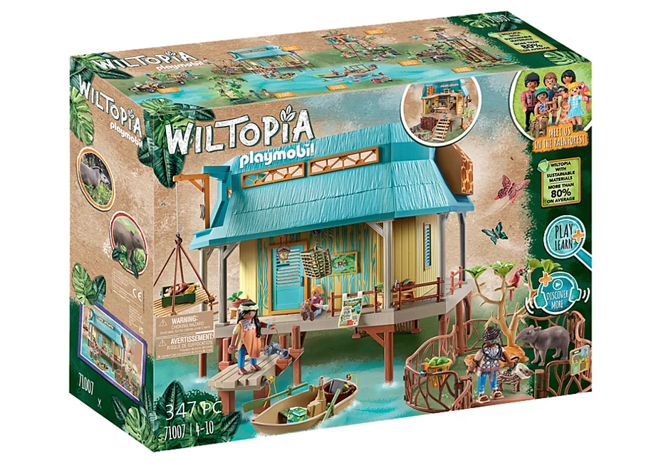 In der Tierklinik werden die Tiere des Regenwaldes gepflegt. Inklusive Gehege, Veterinärbereich mit Behandlungstisch, Röntgen und Wärmelampe (2 x 1,5 V Microbatterien (AAA) erforderlich), Forschungslabor, Steg mit Ruderboot sowie Lastenaufzug. Mit umfangreichem Zubehör und Tierwissenskarte „Tapir“ mit spannenden Audioinhalten. Abmessungen: 58 x 52 x 33 cm (LxTxH). Die Tierpflegestation befindet sich am Fluss. Hier werden die heimischen Tiere gepflegt und aufgezogen. Der Zugang zur Station kann entweder über eine Treppe oder flussseitig über einen Steg erfolgen. Die Station ist gut ausgestattet mit Behandlungsraum mit Tisch, beweglicher OP-Leuchte, Waage, Wärmelampe und beleuchtetem Monitor zur Röntgenbetrachtung. Eine Leiter führt in die oberste Etage der Station. Dort werden Lebensmittel gelagert und Geräte für die Insektenforschung stehen zur Verfügung. Nach erfolgreicher Behandlung können die Tiere die beiden Freigehege zur Erholung nutzen. Derzeit sind dort eine Tapir- und eine Ozelotfamilie untergebracht. Sobald die Tiere wieder gesund sind, werden sie in die Freiheit entlassen. Dieses detailreiche Spielset entführt Kinder in die faszinierende Welt des Amazonas. Das Spielset enthält drei PLAYMOBIL-Figuren, Sofia und Liv Palmer, sowie Stationsleiterin Dr. da Silva, eine voll ausgestattete Tierpflegestation mit Dock und Außengehegen, ein Ruderboot, eine Tapirfamilie, eine Ozelotfamilie, zwei Schmetterlinge, einen Papagei und viele weitere Accessoires für spannende Wildnis-Abenteuer. Mit neuer Figurengröße für Kinder von 5,75 cm. Holen Sie sich die Extraportion Wissen Die Wiltopia Web-App bietet zusätzliche Audio- und Videoinhalte und entführt Kinder direkt in den Lebensraum der Tiere. Einfach den QR-Code auf der Tierwissenskarte scannen und schon kommt die detailreiche Tier- und Pflanzenwelt zu Ihnen nach Hause. Verwenden Sie die coole AR-Funktion, um ein Selfie mit dem Tapir zu machen. Entdecken Sie unterhaltsame Wissensvermittlung mit Spaß und Lerneffekt.