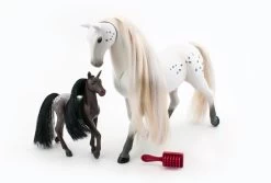 Dies sind keine echten Pferde, auf denen Sie reiten können. Im Gegenzug können Sie sie wie echte Pferde pflegen und pflegen. Ein schönes Appaloosa-Pferd mit einem niedlichen kleinen Fohlen. Leider kann man diese beiden Pferde nicht reiten, dafür sind sie einfach zu klein. Aber Sie können sich um diejenigen kümmern, die die echten Pferde waren. Im Lieferumfang ist eine kleine Bürste enthalten, mit der Sie die langen, schönen und weichen Mähnen der Pferde pflegen können. Zwei süße Pferde, die als Alternative verwendet werden könnten, wenn Sie kein richtiges Pferd bekommen dürfen. Empfohlenes Alter 3+