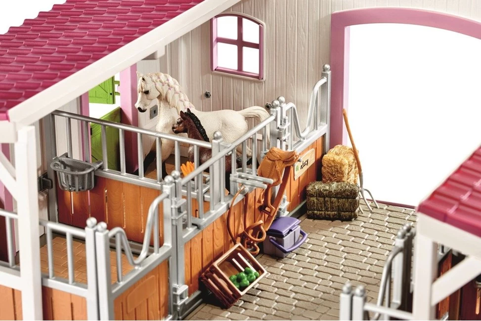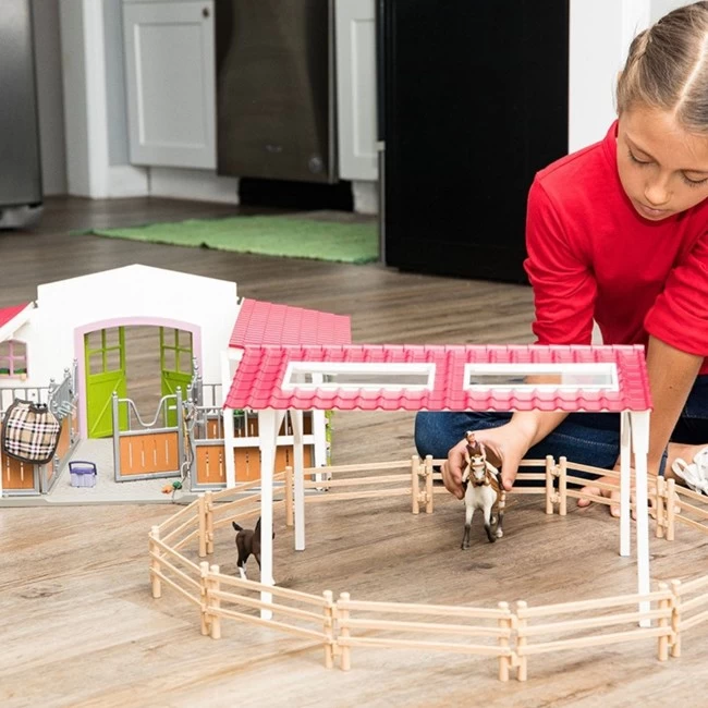 "Endlich! Das neue Stallgebäude ist fertig!" Aufgeregt steigt Lissi ins Auto. Ihre Mutter macht sich auf den Weg. "Hoffentlich ist es wirklich so schön, wie Herr Müller, der Besitzer, es versprochen hat!" hofft Lissi. Sie springt heraus, sobald sie bei den Ställen ankommen. "Wow! Es ist noch schöner als ich es mir vorgestellt habe!" Mit seinen grünen Türen und rosafarbenen Fenstern und Fensterrahmen sieht das Stallgebäude wirklich einfach unglaublich aus. Lissi rennt sofort vom Auto zum Stallgebäude. Ihre geliebte Araberstute Stella steht in einer der großen Boxen. "Ich habe dich so vermisst!" sie ruft. Die zwei Tage, die sie warten mussten, bis sie sich endlich wiedersehen konnten, waren ihr wirklich wie Ewigkeiten vorgekommen. Sie umarmt ihr Pferd und holt die Futterkiste mit Äpfeln und Karotten. Sie füttert Stella – und dann können die beiden endlich ausreiten. Was für ein wunderschöner Tag! Die Sonne scheint, ein junges Araberfohlen tänzelt über die Koppel, die Vögel zwitschern und Lissi freut sich über das neue Stallgebäude. Später wird sie ihre Stute wieder bürsten und füttern und sie mit ihrem besonderen Geschenk zudecken – einer brandneuen Decke. Inhalt: 1 x Reithalle, 12 x Paddocks, 2 x Blumenkästen, 1 x Araberstute, 1 x Araberfohlen, 1 x Freizeitreiter, 1 x Freizeitsattel, 1 x Zaumzeug, 1 x Decke, 1 x Kopfstück, 1 x Heu, 4 x Heufresser, 4 x Tränke, 4 x Sattelhalter, 1 x Massagebürste beige, 1 x Geschirr, 1 x Hufkratzer, 1 x Putzbox, 1 x Karotte, 1 x grüner Apfel, 1 x Mistgabel, 1 x Aufkleber