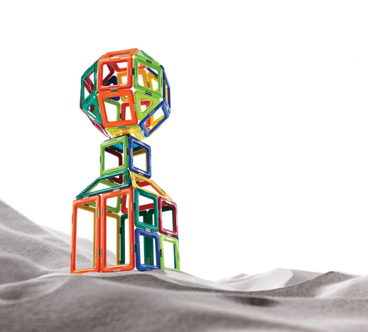 Magnetisches Spielzeug, 70-teiliger Bausatz, davon 36 Quadrate, 12 Dreiecke, 6 Rechtecke, 8 gleichschenklige Dreiecke, 4 Trapeze, 2 LED-Panels, 2 „Spinner“, die rotierende Konstruktionen ermöglichen.