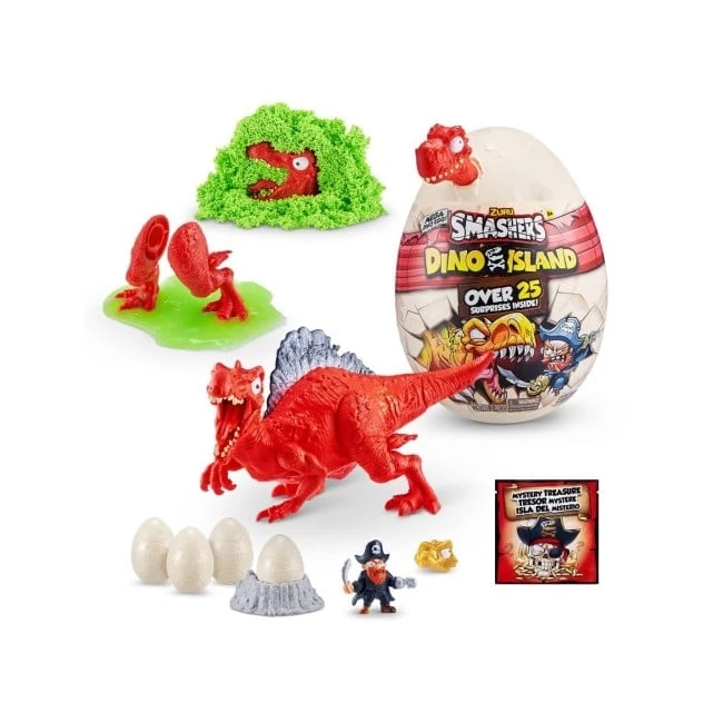 Schlagen Sie sich mit Smashers Dino Island Mega Egg zu einem epischen prähistorischen Abenteuer vor. ZERSTÖRE dein Ei in Stücke, um die 25 versteckten Überraschungen in diesem actiongeladenen Ei aufzudecken! Durchsuche Zuckerwatteschaum, matschigen Sand und super dehnbaren Schleim nach deinen Dino-Teilen! Halten Sie unterwegs Ausschau nach einer lästigen Piratenfigur und 4 epischen Smashers-Mini-Eiern, die exklusive Charaktere enthalten! Schauen Sie genau hin, um die 4 Dino Island-Aufkleber und den neuen goldenen Dino-Schädel-Stiftaufsatz unter Ihren Schätzen zu entdecken. Konstruieren Sie Ihre Dino-Teile, um herauszufinden, welchen Smash-o-saur Sie entdeckt haben! Finden Sie den mächtigen T-Rex oder den verstohlenen Stegosaurus? Worauf wartet ihr noch! Zerschmettere, um deinen neuen, gefährlich epischen Smashers Dino zu entdecken!
